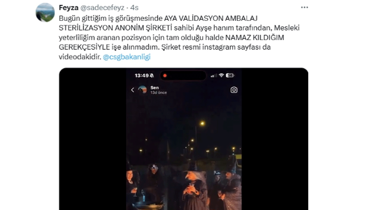 Ankara’da iş başvurusunda bulunduğu laboratuar ve sterilizasyon firmasına namaz kıldığı için işe alınmayan kadın şirketi incelediğinde ‘iyiki almamışlar’ dedi. Şirketin instagram sayfasında bulduğu cadı kıyafetli onlarca kadının alkol ve müzik eşliğinde hem ayin hem parti yaptıkları videoyu paylaşarak “Namaz kılmadığım için beni işe almayan şirketin işte bu” notunu düştü.