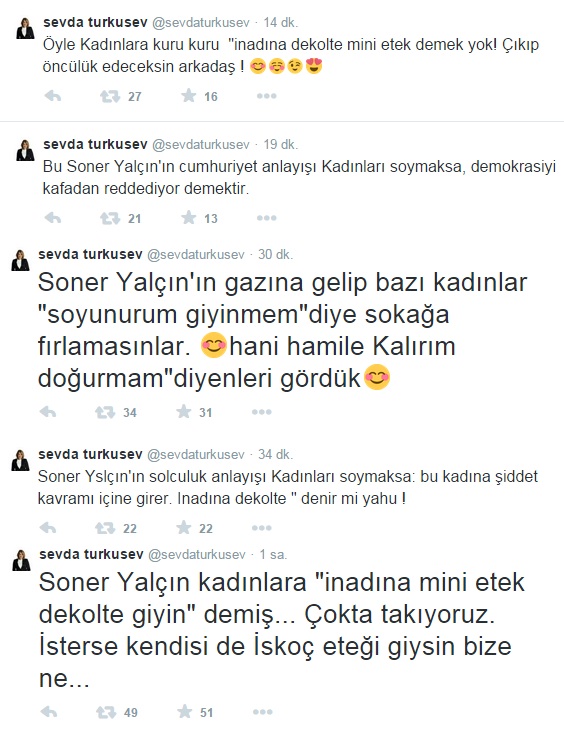 Sevda Türküsev, "İnadına etek giyeceksiniz" diyen Soner Yalçın'a, bu isteğe öncülük etmesi çağrısında bulundu.