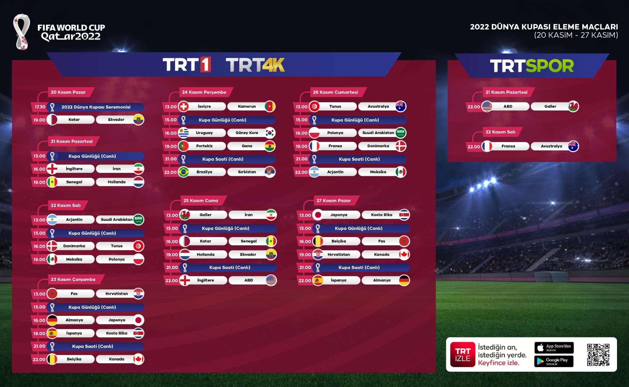 20-27 Kasım tarihleri arası Dünya Kupası maç programı: