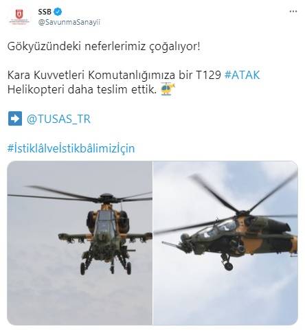 Savunma Sanayii Başkanlığı'ndan yapılan açıklamada TUSAŞ firması tarafından yerli ve milli imkanlarla üretilen bir T129 ATAK helikopterinin daha Kara Kuvvetleri Komutanlığı'na teslim edildiği bildirildi.
