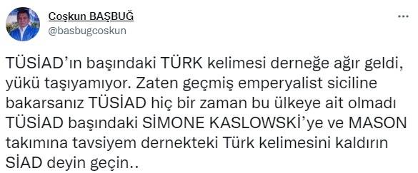 Sosyal medya hesabı üzerinden TÜSİAD’a tepki gösteren Başbuğ, “TÜSİAD’ın başındaki TÜRK kelimesi derneğe ağır geldi, yükü taşıyamıyor. Zaten geçmiş emperyalist siciline bakarsanız TÜSİAD hiç bir zaman bu ülkeye ait olmadı TÜSİAD başındaki Simone Kaslowski’ye ve Mason takımına tavsiyem dernekteki Türk kelimesini kaldırın SİAD deyin geçin” ifadelerini kullandı.