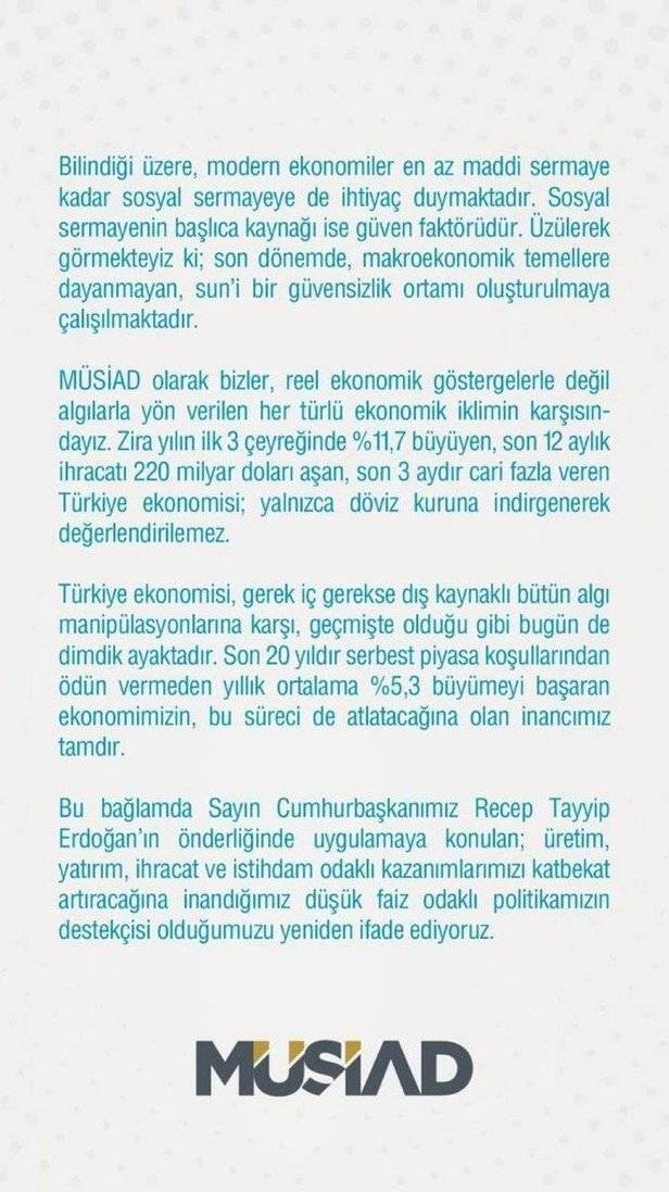 MÜSİAD, Türk ekonomisinin algı manipülasyonlarına karşı dimdik ayakta olduğunu belirterek, "Sayın Cumhurbaşkanımız Recep Tayyip Erdoğan'ın önderliğinde uygulamaya konulan üretim yatırım ihracat ve istihdam kazanımlarımızı katbekat artıracağımıza inandığımız düşük faiz odaklı politikamızın destekçisi olduğumuzu yeniden ifade ediyoruz." açıklamasını yaptı.