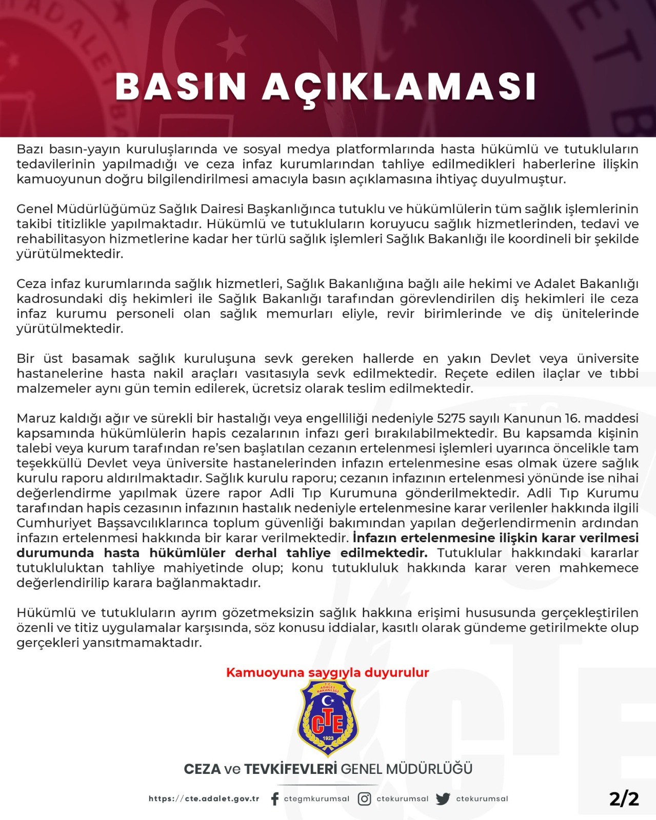 Adalet Bakanlığı Ceza Ve Tevkif Evleri Genel Müdürlüğü hasta tutulu ve hükümlülerin tedavilerinin yapılmadığı ve tahliye edilmedikleri yönünde yer alam bazı haberlerin doğru olmadığını belirterek açıklama yayınladı. Genel Müdürlüğün resmi Twitter hesabından yapılan açıklamada şu ifadelere yer verildi; “