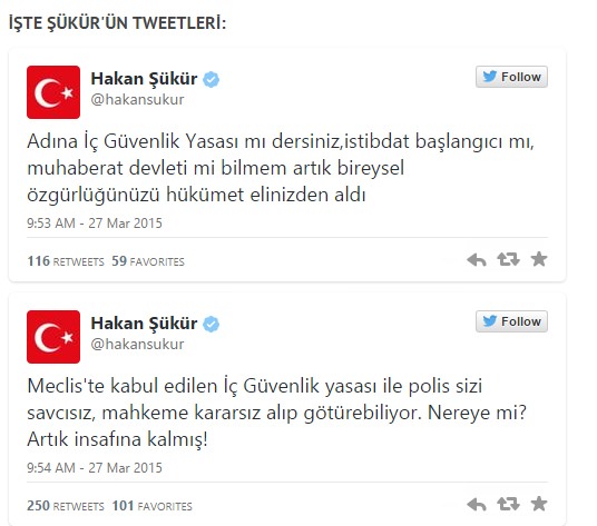 Resmi Twitter hesabından açıklama yapan İstanbul Milletvekili Hakan Şükür, "Adına İç Güvenlik Yasası mı dersiniz, istibdat başlangıcı mı, muhaberat devleti mi bilmem artık bireysel özgürlüğünüzü hükümet elinizden aldı. Meclis'te kabul edilen İç Güvenlik yasası ile polis sizi savcısız, mahkeme kararsız alıp götürebiliyor. Nereye mi? Artık insafına kalmış! Örnek; mahkeme ve savcılık kararı olmadan polis sizi 48 saat gözaltına alıp kimseye haber vermek zorunda değil. Darbe dönemine hoş geldiniz" dedi.