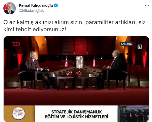 'Haftanın Panoraması' programındaki o görüntüyü paylaşan Kılıçdaroğlu, Twitter hesabından SADAT'ı çirkin ifadelerle hedef aldı.