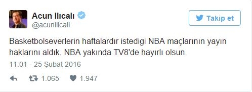 TV8 kanalının sahibi Acun Ilıcalı, NBA maçlarının yayın haklarını aldıklarını açıkladı.