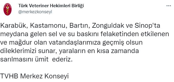 Türk Veteriner Hekimleri Birliği Merkez Konseyi (TVHB) resmi sosyal medya hesabı üzerinden Karabük, Kastamonu, Bartın, Zonguldak ve Sinop’a geçmiş olsun mesajı yayınladı.