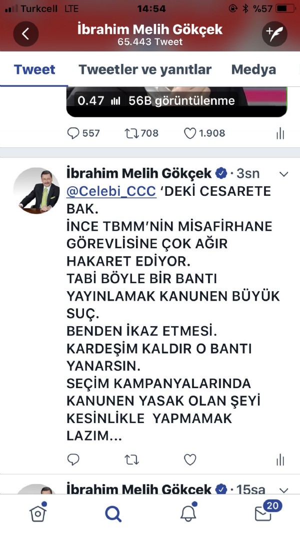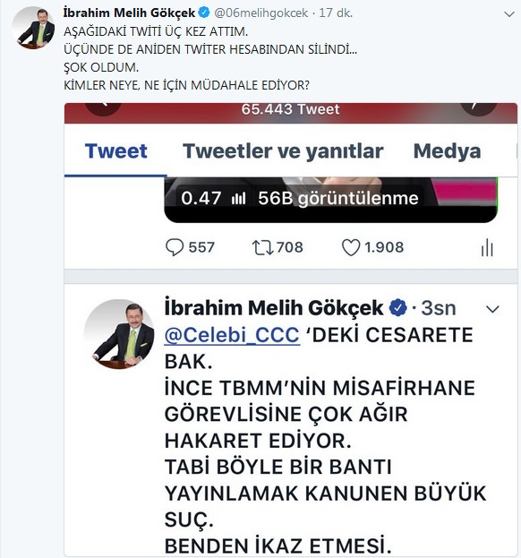 Melih Gökçek tweetlerinin silinmesine sosyal medyadan tepki gösterirken 'AŞAĞIDAKİ TWİTİ ÜÇ KEZ ATTIM. ÜÇÜNDE DE ANİDEN TWİTER HESABINDAN SİLİNDİ... ŞOK OLDUM. KİMLER NEYE, NE İÇİN MÜDAHALE EDİYOR?' notunu düştü.