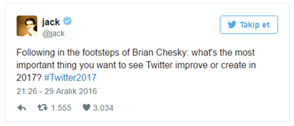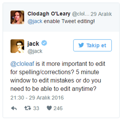 Twitter CEO'su Jack Dorsey, kişisel hesabı üzerinden kullanıcılara 2017'de Twitter'da görmek istedikleri özellikleri sordu ve en fazla verilen cevap “Tweet Düzenleme” özelliği oldu.