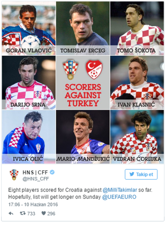Webtekno'da yer alan habere göre turnuvanın başında Hırvatistan'ın resmi Twitter hesabı, Türkiye’ye gol atan futbolcuların fotoğraflarının olduğu, ‘umarız bu liste uzayıp gider’ yazılı bir tweet atmış,