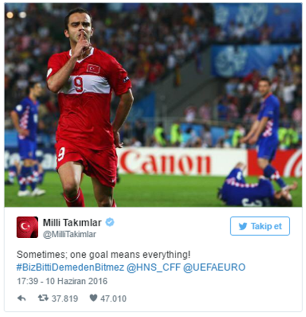 Çek Cumhuriyeti karşısında üstün bir oyunla 2-0 galip gelmiş olsak da Hırvatistan ve İspanya karşısında aldığımız mağlubiyetler, Türk milli takımının bir sonraki tura geçmesine maalesef yetmedi. Fakat bu şampiyona, ülkemizin ne kadar güçlü bir Twitter kullanıcı kitlesine sahip olduğunu da öğrenmemizi sağladı.