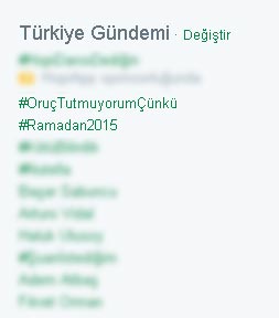 Türkiye'de en çok konuşulanlar (TT) listesinde #Oruçtutmuyorumçünkü hashtag'i ilk sıraya oturdu. Konuyla ilgili olarak bir çok twitter kullanıcısı hashtagi açanları kınadılar. Bununla birlikte bu konuda yazılacak her mesajın hashtagi daha da canlı tutacağı unutulmamalı.