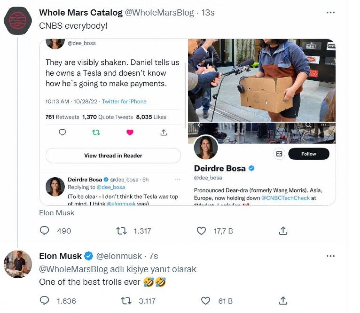 Ellerindeki koliyle Twitter merkez binası önünde muhabirlere konuşan iki kişi şirketten kovulduklarını söyledi, ABD medyası da haberi son dakika koduyla geçti. İki kişinin şaka yaptığı ortaya çıktı, Twitter'ın yeni patronu Elon Musk da durumu, "Gelmiş geçmiş en iyi trolleme" olarak niteledi.