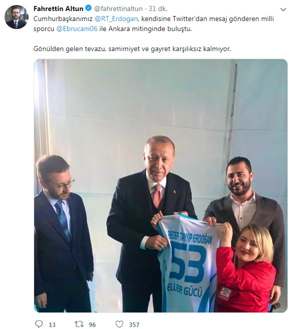 Milli sporcu Ebru Çam, 19 Mart'ta Cumhurbaşkanlığı İletişim Başkanı Prof. Dr. Fahrettin Altun'un, Twitter hesabından AK Parti'nin Kocaeli mitingine ilişkin, "Bizimkisi bir aşk hikayesi" yazarak yayımladığı videoyu paylaşan ve Cumhurbaşkanı Recep Tayyip Erdoğan'ı da etiketleyerek, "Off başkanım bu nasıl duygusal bir ortam böyle... Üzüldüm valla orada olmadığıma gözlerim doldu. 'bu güller senin için, bu gönül ikimizin...'" yazarak paylaşımda bulunmuştu.