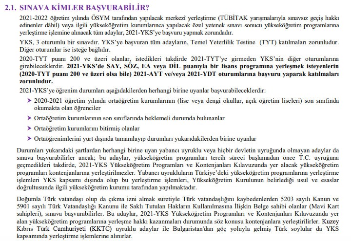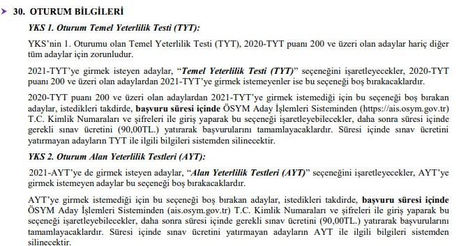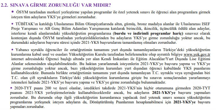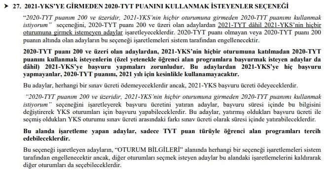 2020-TYT puanı 200 ve üzeri olanlar, istedikleri takdirde 2021-TYT’ye girmeden YKS’nin diğer oturumlarına girebileceklerdir. 2021-YKS’de SAY, SÖZ, EA veya DİL puanıyla bir lisans programına yerleşmek isteyenlerin (2020-TYT puanı 200 ve üzeri olsa bile) 2021-AYT ve/veya 2021-YDT oturumlarına başvuru yaparak katılmaları zorunludur. İşte ÖSYM’nin 2021 YKS başvuru kılavuzunda yer alan TYT’den 200 ve üzeri puan alan adayların durumuna ilişin detaylar.