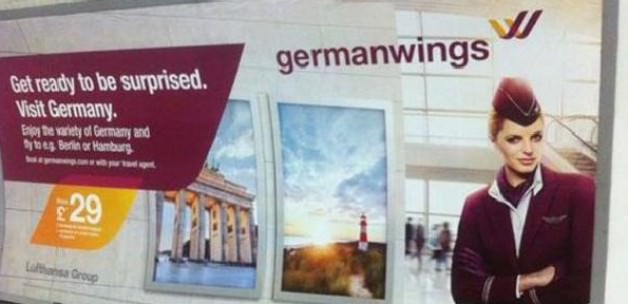 Ucuz Alman Havayolu şirketi Germanwings'in salı günü Barselona-Düsseldorf seferini yapan yolcu uçağının Fransa Alpleri'nde düşmesinin ardından Londra'daki çok sayıda metro istasyonunda görülen reklam afişlerindeki "şaşırmaya hazır olun" cümlesinin çıkarılması dikkat çekti.