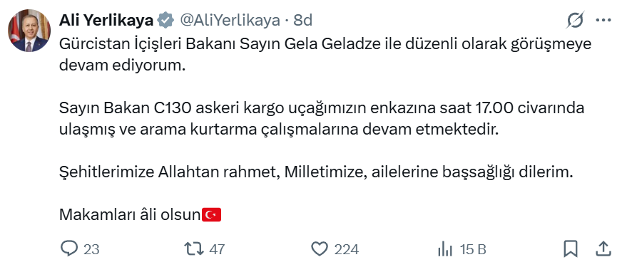 İçişleri Bakanı Ali Yerlikaya, Gürcistan İçişleri Bakanı Gela Geladze ile görüşmelerini sürdürdüğünü belirterek, C130 askeri kargo uçağının enkazına saat 17.00 civarında ulaşıldığını ve arama-kurtarma çalışmalarının devam ettiğini açıkladı. Yerlikaya, şehitlere Allah’tan rahmet, millet ve ailelerine başsağlığı diledi.