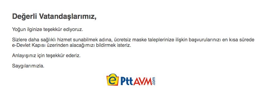 Cumhurbaşkanı Recep Tayyip Erdoğan'ın talimatıyla başlatılan ücretsiz maske dağıtımında başvurular, e-Devlet Kapısı üzerinden alınacak. "PttAVM.com" internet sitesi üzerinden yapılan duyuruda, Sağlık Bakanlığı ile Ulaştırma ve Altyapı Bakanlığının koordinasyonunda "https://maske.epttavm.com" üzerinden yapılacak başvurulara kısa sürede yoğun bir ilgi olduğu belirtildi. Duyuruda, "Sizlere daha sağlıklı hizmet sunabilmek adına, ücretsiz maske taleplerinize ilişkin başvurularınızı en kısa sürede e-Devlet Kapısı üzerinden alacağımızı bildirmek isteriz. Anlayışınız için teşekkür ederiz." ifadelerine yer verildi. Maskelerin, 20-65 yaş arasındaki her vatandaşa ücretsiz olarak dağıtılacağı açıklanmıştı.