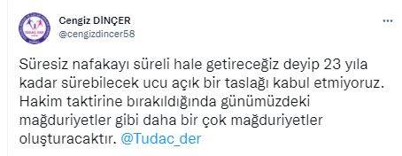 Resmi sosyal medya hesabından paylaşımda bulunan Dağılmış Aileler ve Çocuk Hakları Derneği Başkanı Cengiz Dinçer, “Süresiz nafakayı süreli hale getireceğiz deyip 23 yıla kadar sürebilecek ucu açık bir taslağı kabul etmiyoruz. Hakim taktirine bırakıldığında günümüzdeki mağduriyetler gibi daha bir çok mağduriyetler oluşturacaktır” diye konuştu.