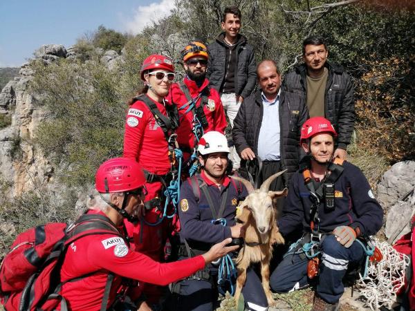 Halatlarla sarp kayalardan aşağı inen ekipler, yatay geçiş yöntemi ile ulaştıkları keçiyi kurtararak sahibine teslim etti.