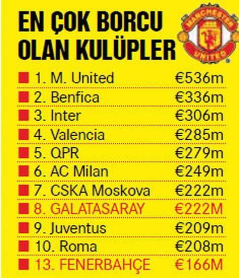 Araştırma, kıtanın en çok borca sahip kulüplerini de ortaya koydu. Buna göre Manchester United, 536 milyon Euro net borçla uzak ara bir numara... En borçlular arasında Fenerbahçe ve Galatasaray da bulunuyor. Öte yandan Türkiye 51.3’lük teknik direktör yaş ortalaması ile Avrupa üçüncüsü.