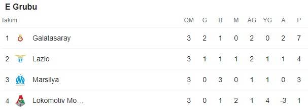 Grupta oynadığı 3 maçta 2 galibiyet ve bir beraberlik elde eden Galatasaray, 7 puanla liderliğini sürdürdü. Günün diğer maçında sahasında Olimpik Marsilya ile 0-0 berabere kalan Lazio, 4 puanla ikinci sırada yer aldı.