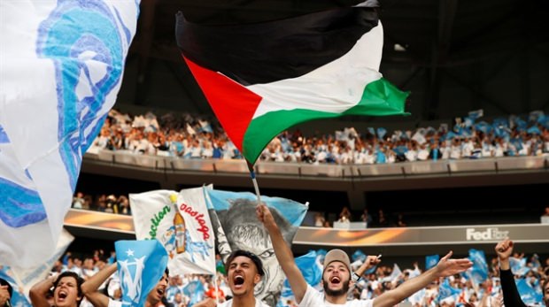 Marsilya ile Atletico Madrid arasında oynanacak UEFA Avrupa Ligi finali öncesinde Marsilyalı taraftarlar tribünlerde Filistin bayrakları dalgalandırdı.