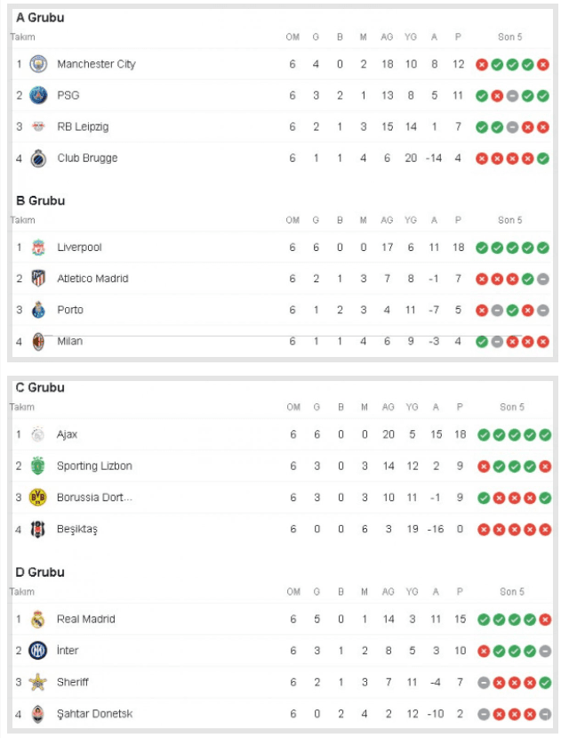 UEFA Şampiyonlar Ligi son haftada A, B, C ve D gruplarındaki karşılaşmalar tamamlandı. İşte sonuçlar..