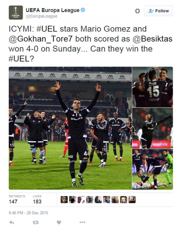 Hesaptan yapılan paylaşımda, Beşiktaş'ın 4-0'lık Konyaspor galibiyeti hatırlatılırken; Gökhan Töre ve Mario Gomez'in gol attığına dikkat çekildi. Ancak mesajın final bölümünde bomba patladı. Hesaptan takipçilere, "Beşiktaş UEFA Avrupa Ligi'ni kazanabilir mi?" sorusu yöneltildi.