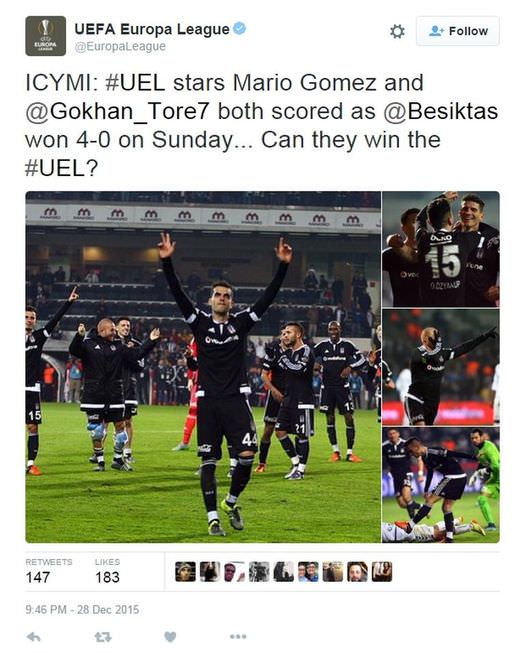 UEFA Avrupa Ligi ile ilgili paylaşımları yapan UEFA'nın resmi hesabı, Beşiktaş'ı Avrupa'ya geri taşıdı. Paylaşımda Beşiktaş'ın Torku Konyaspor'u 4-0 mağlup ettiği hatırlatılırken, Gökhan Töre ve Mario Gomez'in skora katkı sağladığına vurgu yapıldı. Mesajın son bölümünde ise takipçilere, "Beşiktaş UEFA Avrupa Ligi'ni kazanabilir mi" sorusu yönetildi.