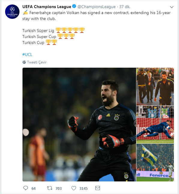 UEFA'nın Şampiyonlar Ligi ile ilgili resmi paylaşımlarının yer aldığı "@ChampionsLeague" hesabından yapılan bildirimde, Fenerbahçe Futbol Takımı Kaptanı Volkan Demirel'in, 16 yıldır formasını giydiği takımıyla yeni bir sözleşme imzaladığı aktarıldı.