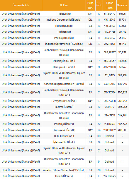 Ufuk Üniversitesi 2021 taban puanları, yüzdelik dilimleri ve kontenjan sayıları