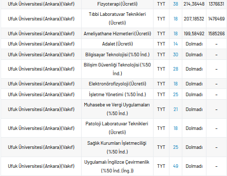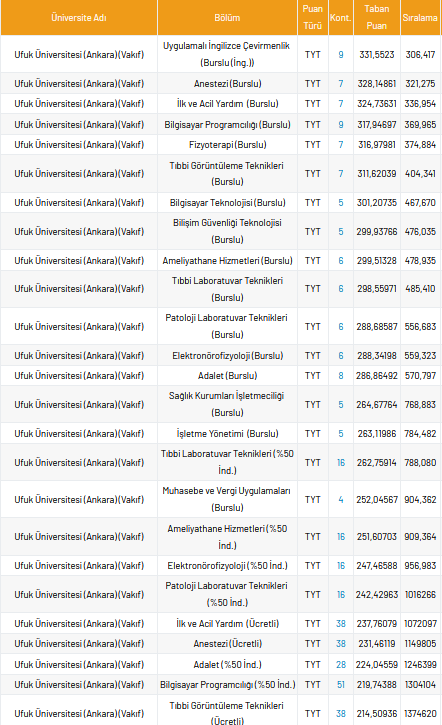 Ufuk Üniversitesi 2 yıllık taban puanları 2021, yüzdelik dilimleri ve kontenjan sayıları kaçtır?