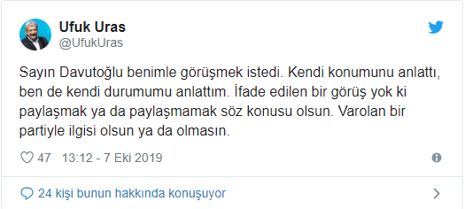 Ufuk Uras, Twitter'dan yaptığı paylaşımda görüşmeye kendisini Davutoğlu'nun davet ettiğini belirterek şöyle dedi: Sayın Davutoğlu benimle görüşmek istedi.