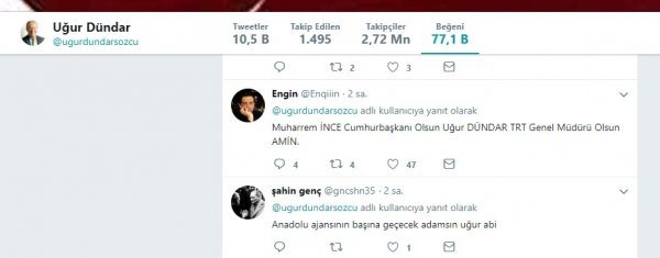 Kendisini Anadolu Ajansı'nın ya da TRT'nin başında görmek takipçilerinin attığı tweetleri beğenen Uğur Dündar, seçimlere ilişkin "En önemli yurttaşlık görevlerimizden birini yerine getirmenin iç huzurunu yaşıyoruz. Her şey daha güzel bir Türkiye için. Başka Türkiye yok." dedi.