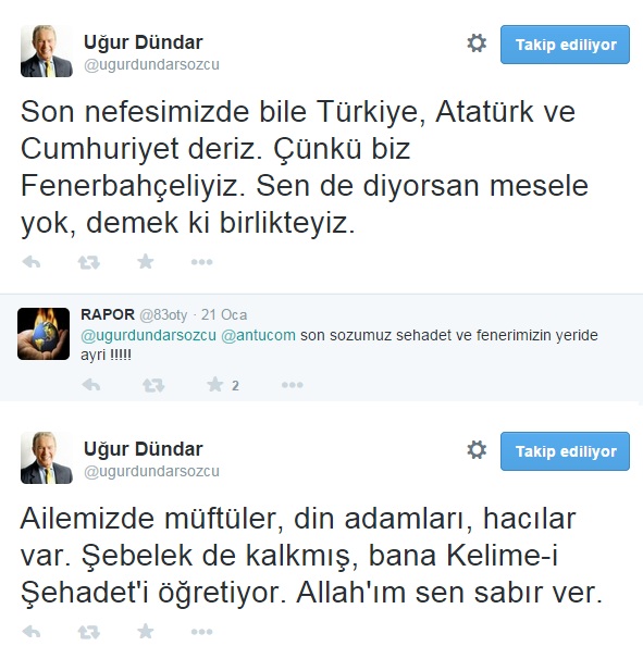 YENİAKİT.COM.TR - Sözcü adlı gazetede kalem oynatan Uğur Dündar, Twitter hesabından paylaştığı yorumunda "Son nefesimizde bile Cumhuriyet, Mustafa Kemal deriz" ifadelerini kullandı. Dündar'ın yorumu üzerine bir takipçisi "Son sözümüz şehadet" uyarısında bulundu. Bunun üzerine, Cuma namazını kılan öğrencileri suç işliyorlarmış gibi haberleştirmesiyle akıllara kazınan Dündar, ailesinde müftülerin, hacıların olduğunu dile getirerek Kelime-i şehadet hatırlatması yapan takipçisine çıkıştı.