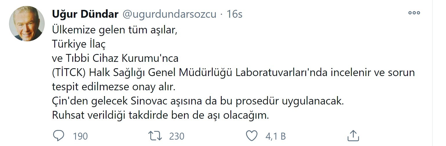 Sözcü yazarı Uğur Dündar, koronavirüse karşı geliştirilen aşıyı olacağını kaydederek, "Ülkemize gelen tüm aşılar, Türkiye İlaç ve Tıbbi Cihaz Kurumu'nca (TİTCK) Halk Sağlığı Genel Müdürlüğü Laboratuvarları'nda incelenir ve sorun tespit edilmezse onay alır. Çin'den gelecek Sinovac aşısına da bu prosedür uygulanacak. Ruhsat verildiği takdirde ben de aşı olacağım" dedi.