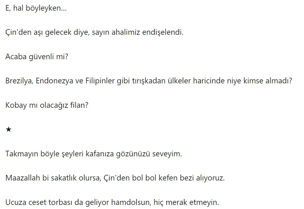 Yine aynı gazetede yazarlık yapan Yılmaz Özdil ise, koronavirüs aşısı ile adete alay etti. Yılmaz Özdil, "Çin'de aşı gelecek diye sayın ahalimiz endişelendi. Aca güvenli mi? Brezilya, Endonezya ve Filipinler gibi tırışkadan ülkeler haricinde niye kimse almadı? Kobay mı olacağız? Takmayın böyle şeyleri kafanıza gözünüzü seveyim. Mazatlık bir sakatlık olursa, Çin'den bol bol kefen bezi alıyoruz. Ucuza ceset torbası geliyor' diyerek koronavirüs aşısının güvenli olmadığını öne sürdü.