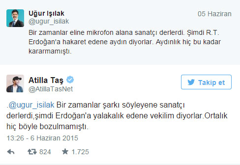 7 Haziran genel seçimlere bir gün kala AK Parti milletvekili adayı Uğur Işılak ile sanatçı Atilla Taş Twitter'dan kapıştı..