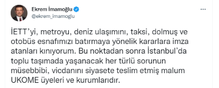 UKOME'nin teklifi reddetmesinden sonra Twitter hesabından paylaşımda bulunan CHP'li İBB Başkanı Ekrem İmamoğlu, ulaşımda aksaklık tehdidinde bulunarak, şu ifadeleri kullandı: