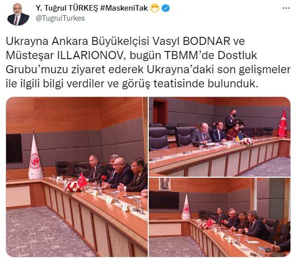 Ak Parti Ankara Milletvekili Y. Tuğrul Türkeş sosyal medya hesabından Ukrayna’nın Ankara Büyükelçisi Vasyl Bodnar ve Müsteşar Illarıonov’u TBMM’deki dostluk grubunda ağırladıklarını duyurdu. Türkeş paylaşımında, “Ukrayna Ankara Büyükelçisi Vasyl BODNAR ve Müsteşar ILLARIONOV, bugün TBMM’de Dostluk Grubu’muzu ziyaret ederek Ukrayna’daki son gelişmeler ile ilgili bilgi verdiler ve görüş teatisinde bulunduk.” ifadelerini kullanarak kabul sırasında çekilen fotoğrafları da paylaşarak, görüşme hakkında da kısa bilgilendirmede bulundu.