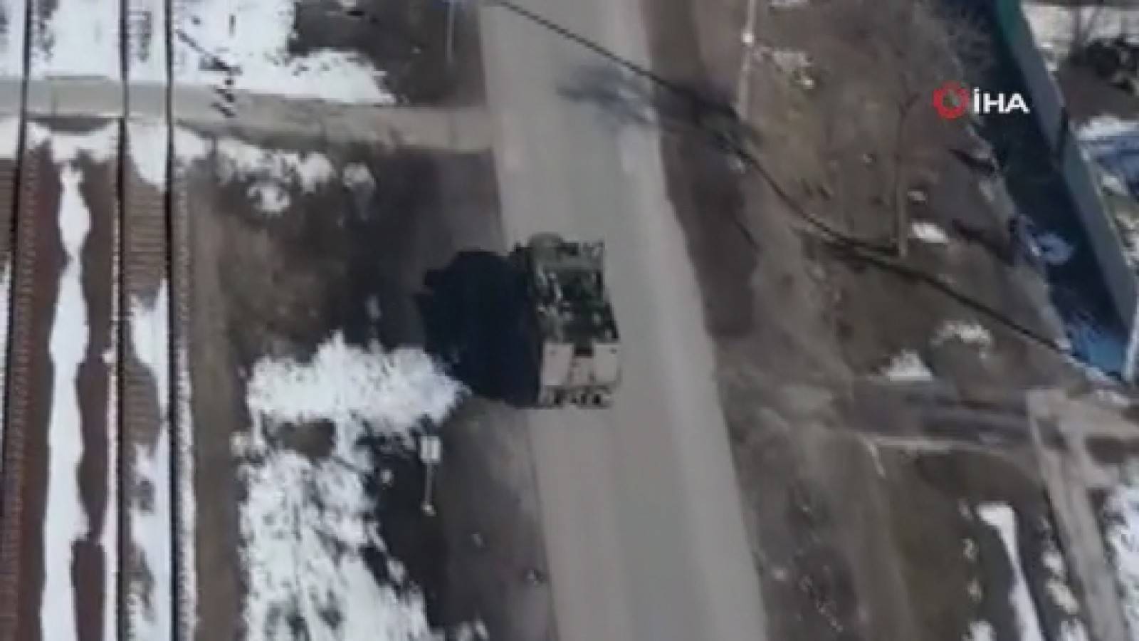 Ukrayna ordusu, Rus askerlerini taşıyan araca yapılan saldırının havadan ve karadan görüntülerini yayınladı.