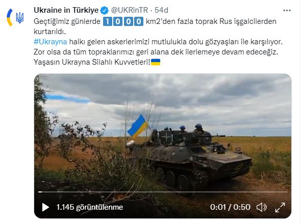 Ukrayna’nın Ankara Büyükelçiliği sosyal medya hesabından yaptığı açıklamayla Rusya’nın işgal ettiği toprakları geri aldıklarını duyuruydu. Yapılan açıklamada, “Geçtiğimiz günlerde 1000 km2’den fazla toprak Rus işgalcilerden kurtarıldı. Ukrayna halkı gelen askerlerimizi mutlulukla dolu gözyaşları ile karşılıyor. Zor olsa da tüm topraklarımızı geri alana dek ilerlemeye devam edeceğiz. Yaşasın Ukrayna Silahlı Kuvvetleri” ifadeleri kullanıldı. Öte yandan Ukrayna Devlet Başkanı Volodimir Zelenskiy'nin sosyal medya hesabından paylaştığı görüntüde Balakliya ilçesindeki binanın çatısında Ukrayna bayrağının dalgalandığı ve 3 Ukrayna askerinin bulunduğu görülüyor.