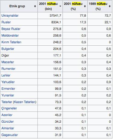 2001 Ukrayna nüfus sayımında etnik dağılım, toplam sayılan 48.457.100 kişi üzerinden değil, yerleşik nüfus olan 48.241.000 kişi üzerinden yapılmıştır.10 yılda bir yapılması planlanan nüfus sayımı her yıl ertelenmiş, sonunda Devlet İstatistik Hizmetleri tarafından 2016 yılında gerçekleştirilmesine karar verilmiştir.