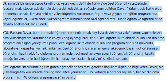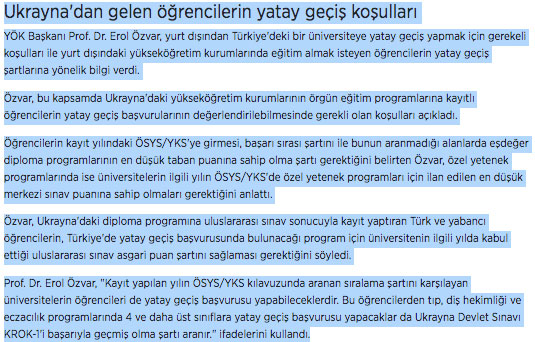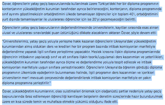 YÖK Başkanı Erol Özvar, Ukrayna'da okuyan Türk öğrencilerin 11-15 Nisan tarihlerinde yatay geçiş için gerekli belgelerle ilgili yükseköğretim kurumlarına başvuru yapabileceğini açıkladı. Özvar, "2021-2022 eğitim ve öğretim yılı güz dönemi ve öncesinde Ukrayna'daki tanınan bir yükseköğretim kurumuna kayıt yaptırmış ve yatay geçiş şartlarını sağlayamayan öğrencilerin ise 11-15 Nisan'da mesai bitimine kadar özel öğrencilik için başvuru yapmaları gerekmektedir. Yatay geçiş başvurusu yapan ancak yararlanamayan öğrencilerin ise 26-29 Nisan'da mesai bitimine kadar özel öğrencilik için gerekli belgelerle beraber ilgili yükseköğretim kurumlarına başvuru yapmaları gerekmektedir." bilgisini verdi.