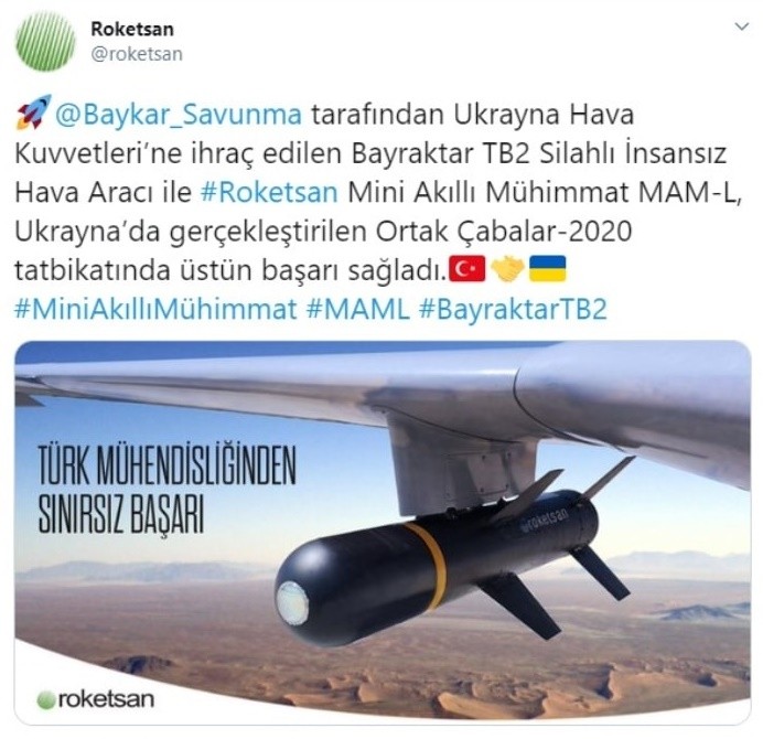 ROKETSAN'dan tatbikata ilişkin yapılan açıklamada, "Baykar tarafından Ukrayna Hava Kuvvetleri’ne ihraç edilen Bayraktar TB2 Silahlı İnsansız Hava Aracı ile Roketsan Mini Akıllı Mühimmat MAM-L, Ukrayna’da gerçekleştirilen Ortak Çabalar-2020 tatbikatında üstün başarı sağladı. Tatbikat sırasında Bayraktar TB2’den ateşlenen 7 adet MAM-L'mizin tamamı, belirlenen hedeflerin hepsini başarıyla imha etmeyi başardı. Bu gurur ve mutluluk hepimizin!" ifadelerine yer verildi.