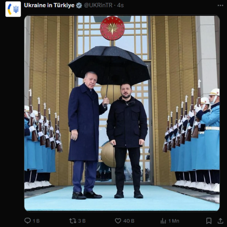 Ukrayna'nın Ankara Büyükelçiliği X sosyal medya hesabından yapılan paylaşımda, Cumhurbaşkanı Recep Tayyip Erdoğan'ın 18 Şubat'ta Beştepe'de Zelensky'yi karşıladığı anlardan bir kare yer aldı.