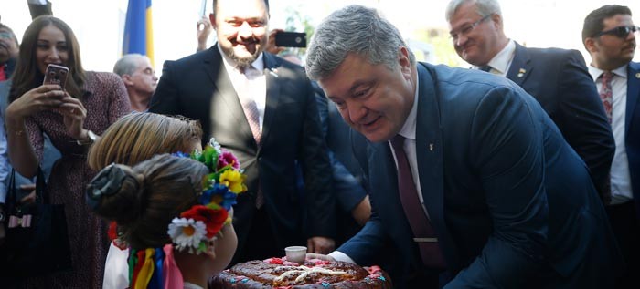 Yöresel kıyafetli Ukraynalıların, Poroşenko'yu müzik ve şarkılar eşliğinde karşıladığı program öncesi çocuklar, Ukrayna Devlet Başkanına ülkenin geleneksel ekmeğini takdim etti.