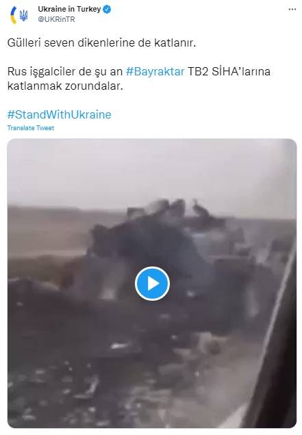Türkiye'den satın alınan Bayraktar TB2 SİHA'ların Rus konvoyunu imha ettiği görüntüleri paylaşan büyükelçilik, "Gülleri seven dikenlerine de katlanır. Rus işgalciler de şu an Bayraktar TB2 SİHA’larına katlanmak zorundalar" ifadelerini kullandı.