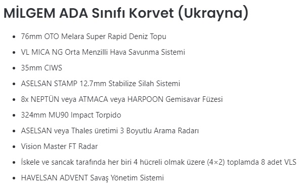 Ukrayna Savunma Bakanlığı tarafından yapılan açıklamaya göre ise Ukrayna’ya ait ADA Sınıfı MİLGEM korvetlerinin silahlanması şu şekilde olacak: